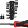 - 9 Bit-Einsätze, Länge 55 mm, Antrieb Innenvierkant 12,5 mm (1/2″), Abtrieb Innensechskant: 5 – 6 – 7 – 8 – 10 – 12 – 14 – 17 – 19 mm
