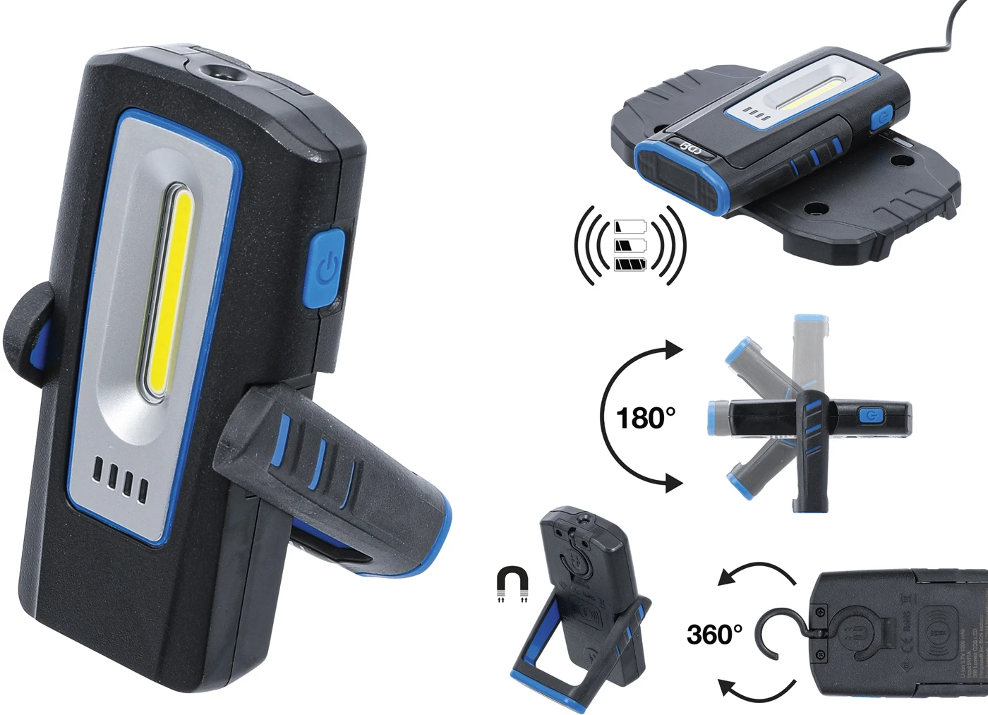 - 1 herausklappbare und um 360° schwenkbare Haken auf der Gehäuserückseite, zur Befestigung der Lampe an vielen Stellen