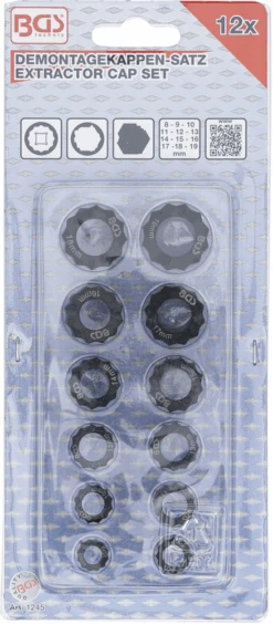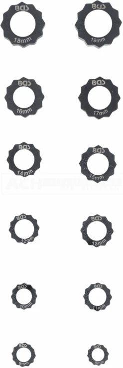 - beinhaltet 12 Adapterkappen in folgenden Größen: 8 – 9 – 10 – 11 – 12 – 13 – 14 – 15 – 16 – 17 – 18 – 19 mm