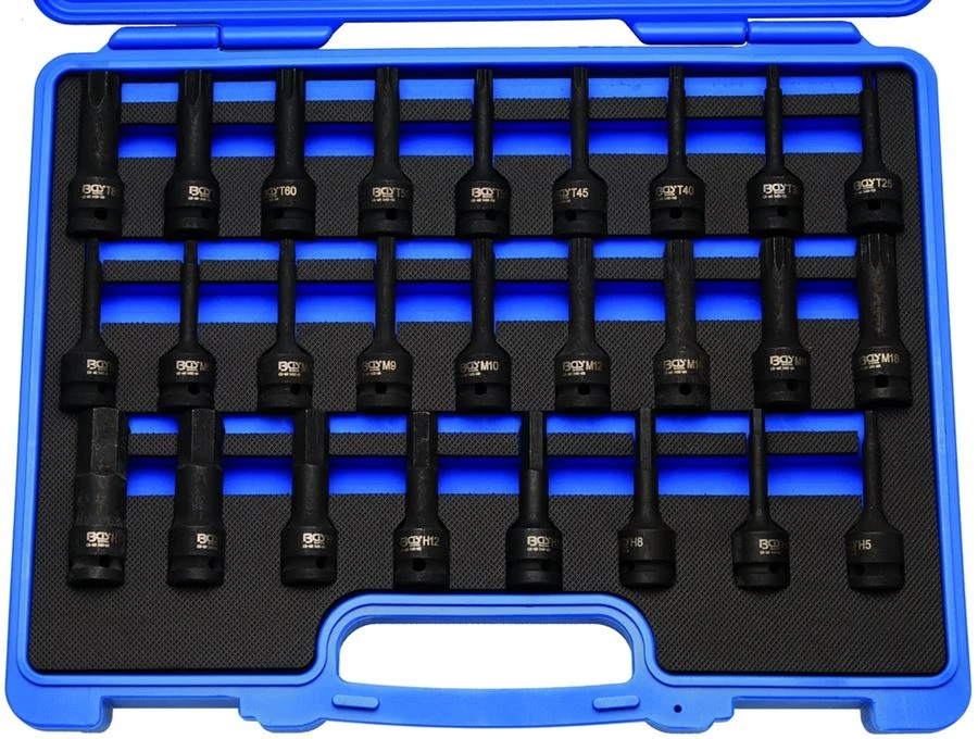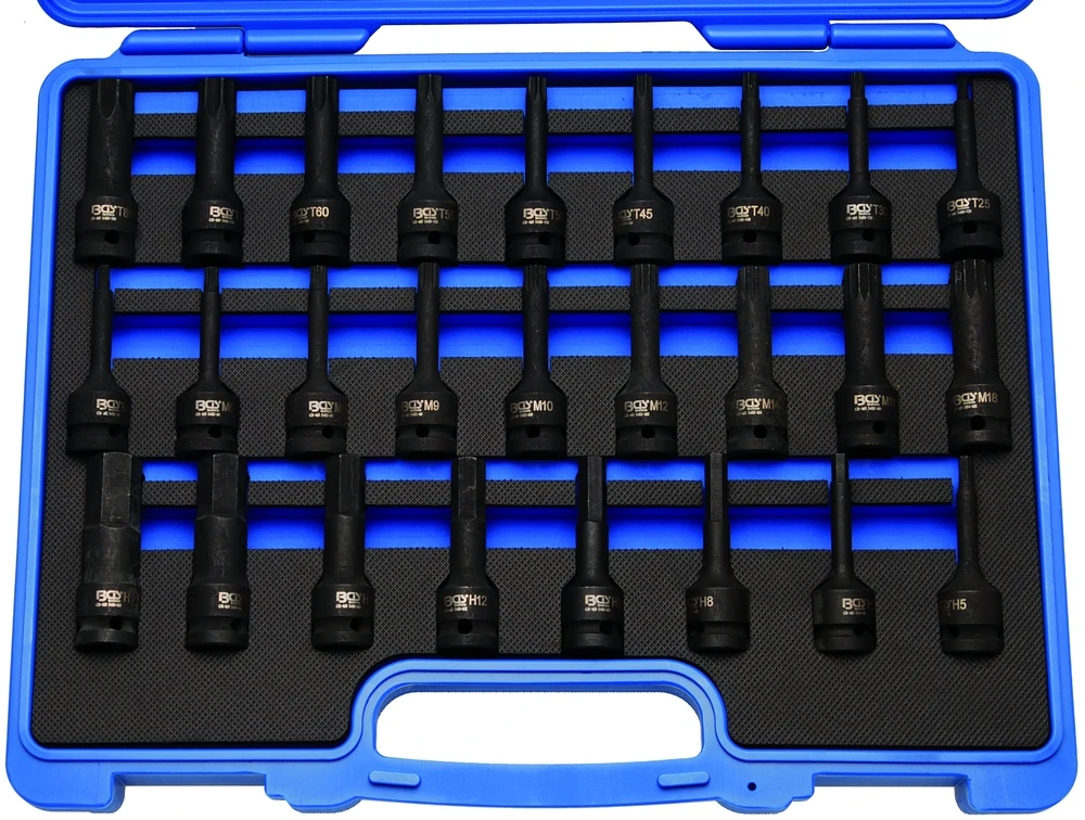 - Kraft-Bit-Einsatz, Antrieb Innenvierkant 12,5 mm (1/2″), Abtrieb T-Profil (fĂĽr Torx): T25 – T30 – T40 – T45 – T50 – T55 – T60 – T70 – T80