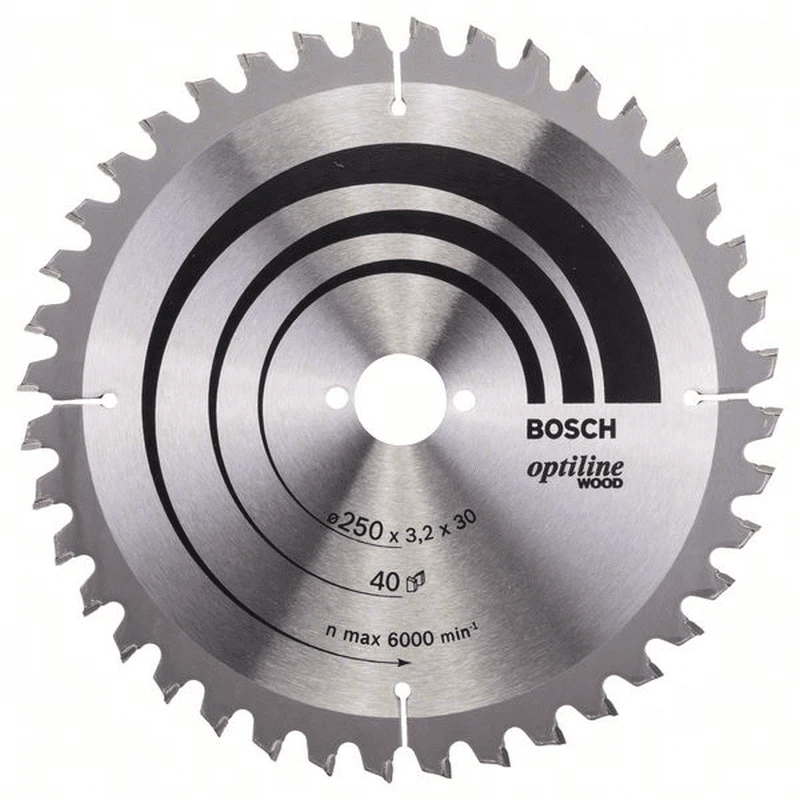 Kreissägeblatt Optiline Wood für Kapp- und Gehrungssägen. Außendurchmesser: 250 mm, Bohrung: 30 mm, Schnittbreite: 3,2 mm, Zähnezahl: 40, Zahnform: WZ Negativ. Das präzise Blatt für den Qualitätsschnitt in allen Holzarten.