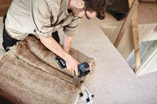 - Zuschnitt flexibler Dämmstoffe wie Glaswolle, Steinwolle und Naturfasern (mit Schneidgarnitur Wellenschliff-Sägeblatt)