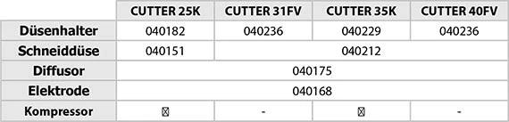 1 Düsenhalter, 3 Schneiddüsen, 1 Diffusor und 3 Elektroden