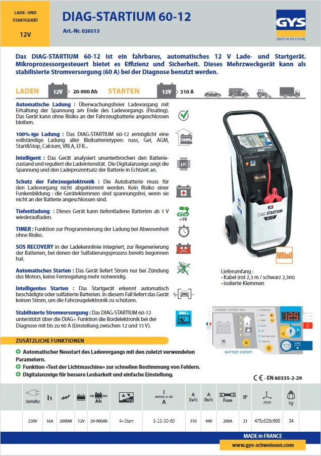 Das DIAG STARTIUM 60-12 ist ein automatisches und fahrbares 12V Lade- und Startgerät.