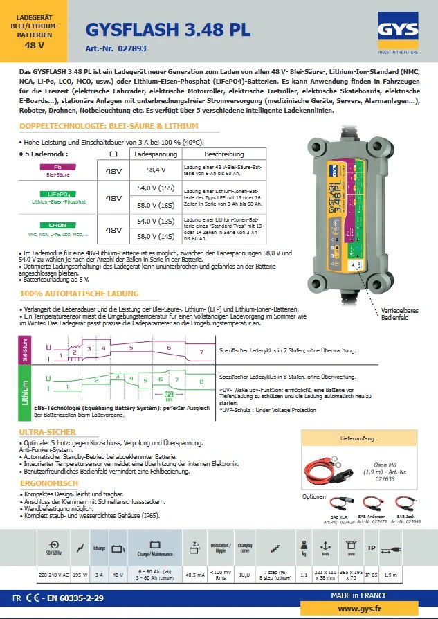 Das GYSFLASH 3.48 PL ist ein Ladegerät neuer Generation zum Laden von allen 48 V- Blei-Säure-, Lithium-Ion-Standard (NMC, NCA, Li-Po, LCO, MCO, usw.) oder Lithium-Eisen-Phosphat (LiFePO4)-Batterien. Es kann Anwendung finden in Fahrzeugen für die Freizeit (elektrische Fahrräder, elektrische Motorroller, elektrische Tretroller, elektrische Skateboards, elektrische E-Boards…), stationäre Anlagen mit unterbrechungsfreier Stromversorgung (medizinische Geräte, Servers, Alarmanlagen…), Roboter, Drohnen, Notbeleuchtung etc. Es verfügt über 5 verschiedene intelligente Ladekennlinien.