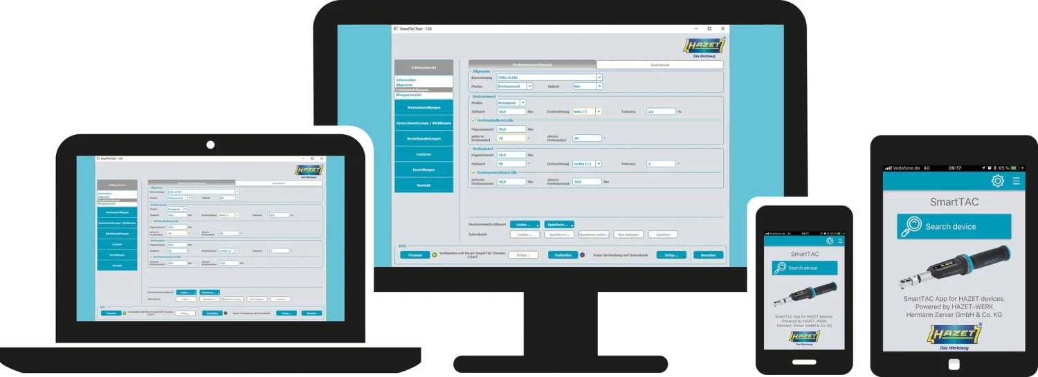 - HAZET Smart Technologie bestehend aus optionaler SmartTAC-App und Low Energy-Bluetooth-Schnittstelle (kann nationalen Zulassungsbeschränkungen unterliegen) mit problemlosem Live-Datenaustausch zur Anzeige des Schraubverlaufes auf mobilen Endgeräten, wie Smartphone (Smartwatch) und Tablet-PC sowie über eine USB-C-Schnittstelle zur Programmierung der Drehmoment-Drehwinkelschlüssel und Dokumentation der Schraubdaten über Laptop und PC