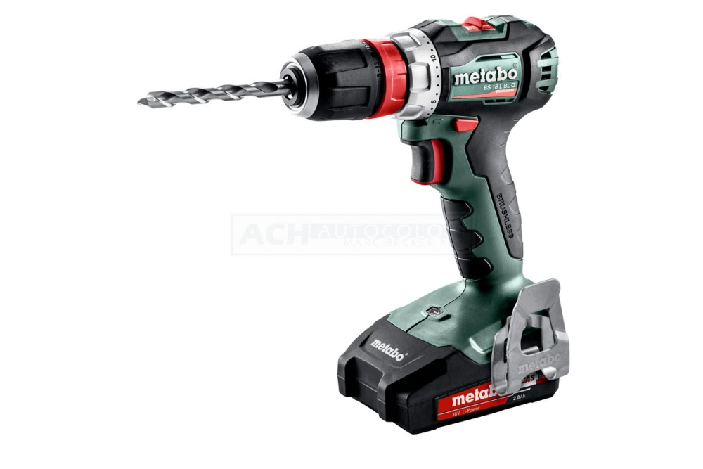 Schnellwechselbohrfutter, Gürtelhaken und Bitdepot, 2 Li-Power Akkupacks (18 V/2,0 Ah), Ladegerät SC 30, Kunststoffkoffer