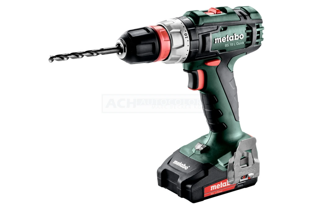 Schnellwechselbohrfutter, Gürtelhaken und Bitdepot, 2 Li-Power Akkupacks (18 V/2,0 Ah), Ladegerät SC 30, Kunststoffkoffer