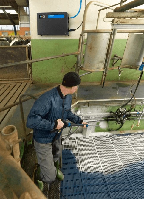 - The industrial pumps make it possible to feed the units with hot inlet water from 70°C (with break tank) to 85°C (direct feed) for max. cleaning efficiency